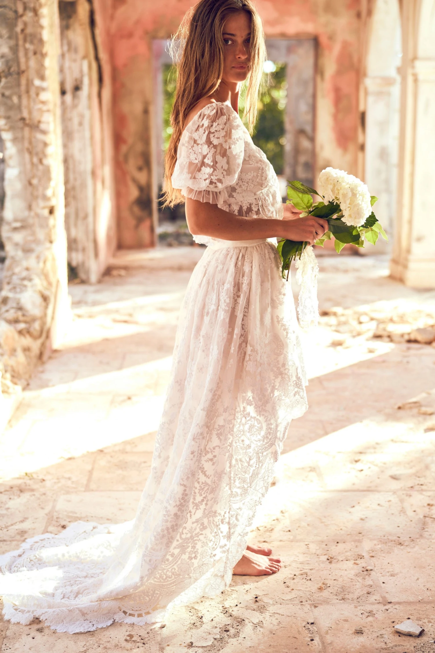 Float down the aisle to your perfect future in our Halsey Skirt, a dream in cotton and antique mesh with intricate, floral cotton-threaded embroidery. The traditional and modern meet in this graceful high-low skirt, which evokes an antique patina with contemporary lines. Below a fixed double grosgrain tape waistband (which features a hand-embroidered bow as your subtle something blue at left-back), the carefully constructed full sweep shirred skirt has side-seam pockets and scalloped embroidery finish at the hem, shorter at the front and longer at back (with a dramatic English bustle). Side seam zipper closure. Shown here in White.