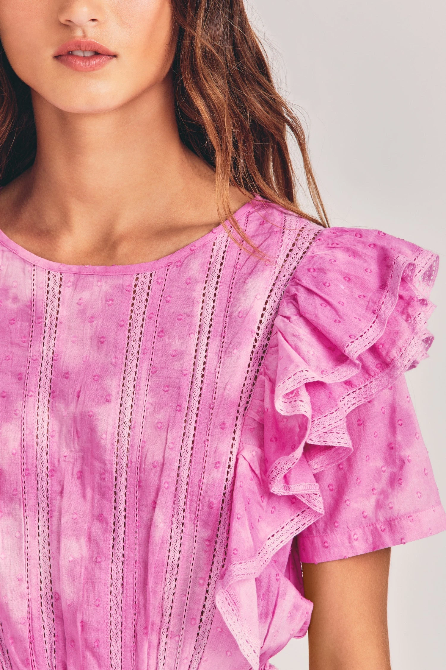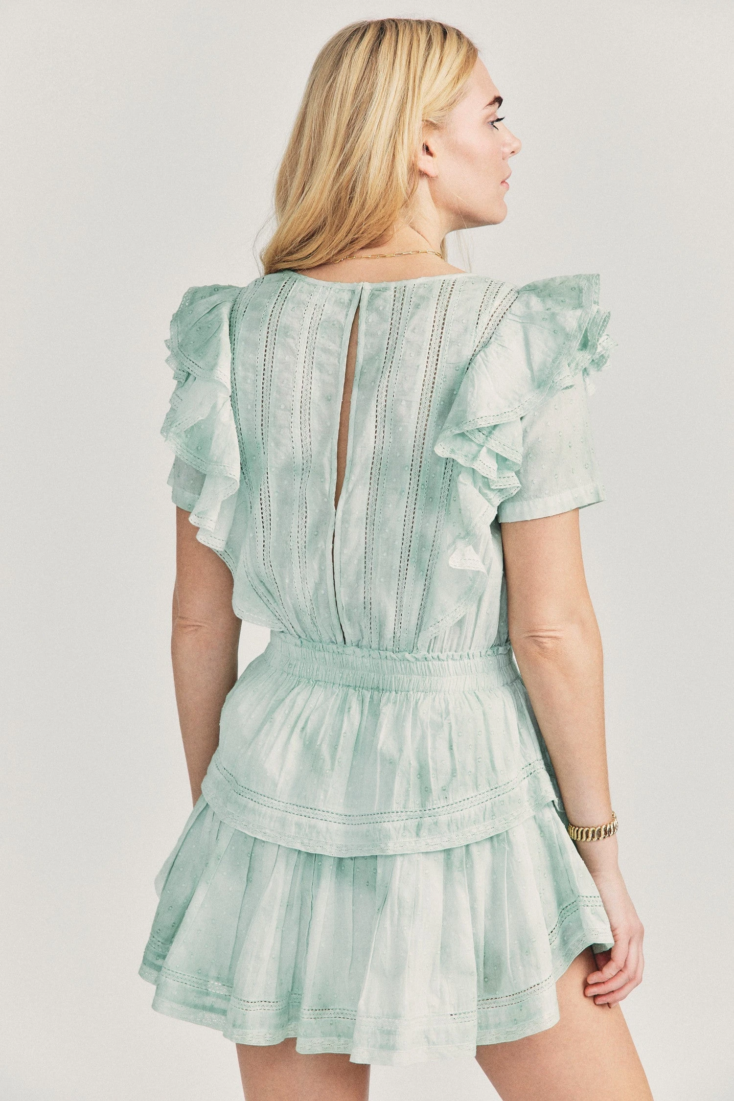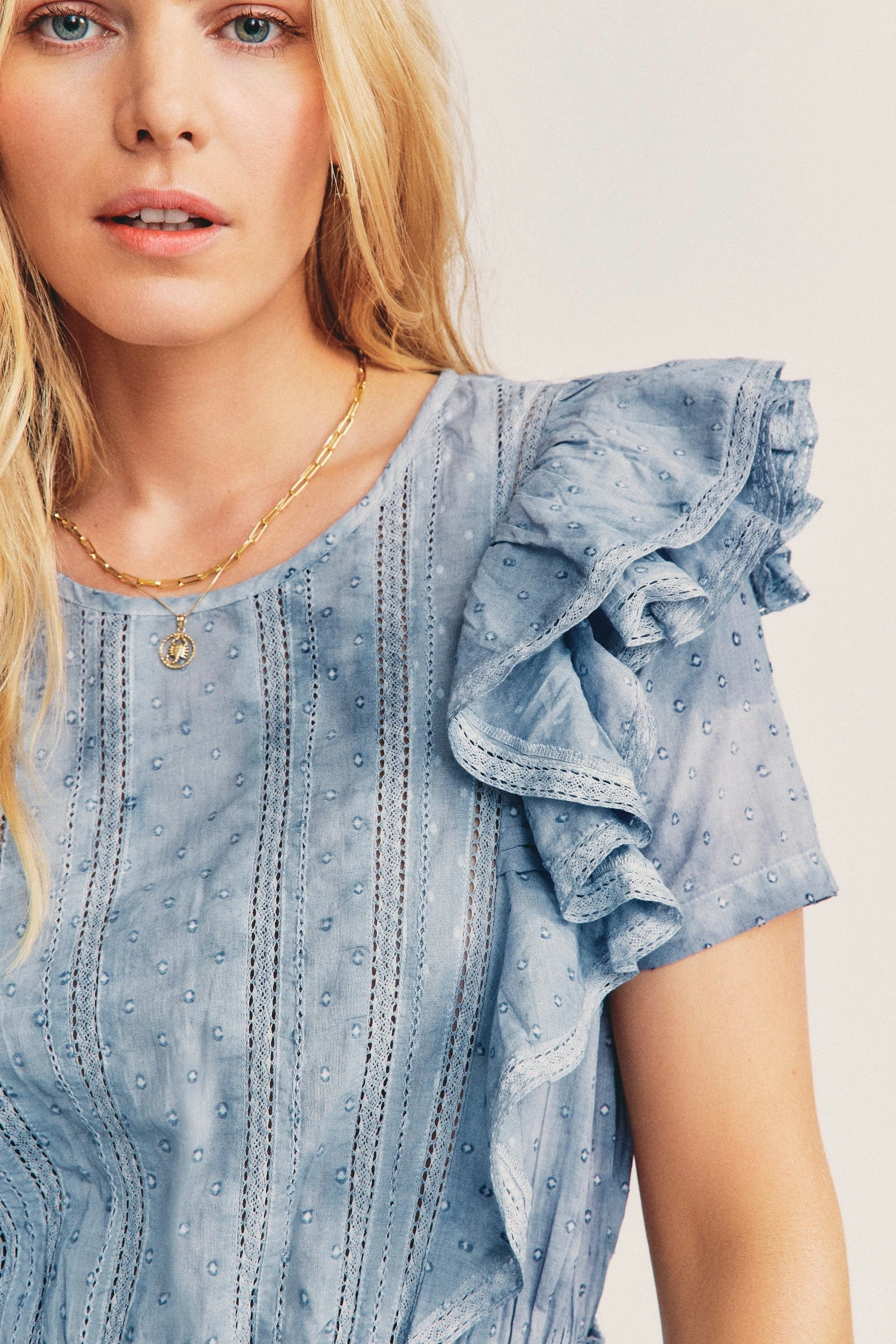 Our signature Natasha Dress returns in 100% polkadot dobby cotton. This easy frock features double ruffled flutter sleeves, which cascade down the front and back of the body to highlight the elasticated waist. Intricate custom lace panels are inset and trim the skirt’s flounces.