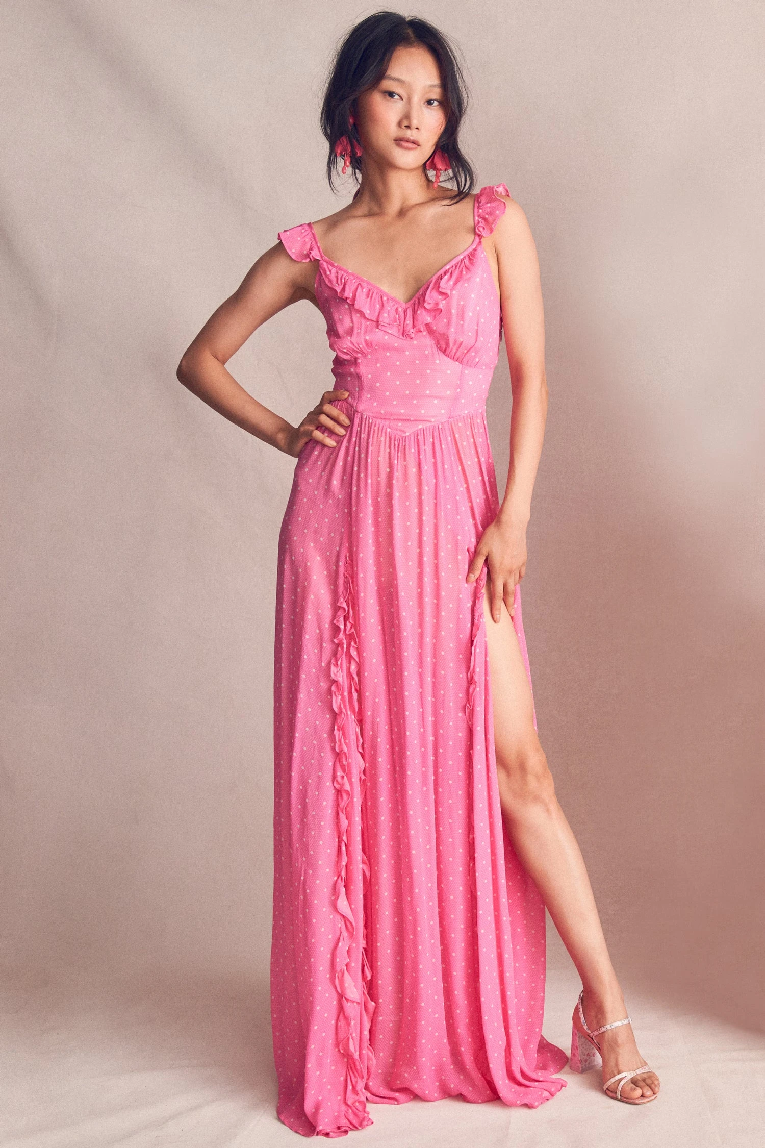 Spring has sprung in our Junia Dress, a delight in silky viscose with a scaled polkadot print. This cheerful frock has a ruffle-trimmed straps mirrored by a flounce along the v-neck. The bust has shirred cups above a princess-seamed, v-shaped bodice. The shirred skirt drapes to a dramatic ruffle-trimmed slit at wearer’s left thigh. Shown here in Hot Pink Cherry.