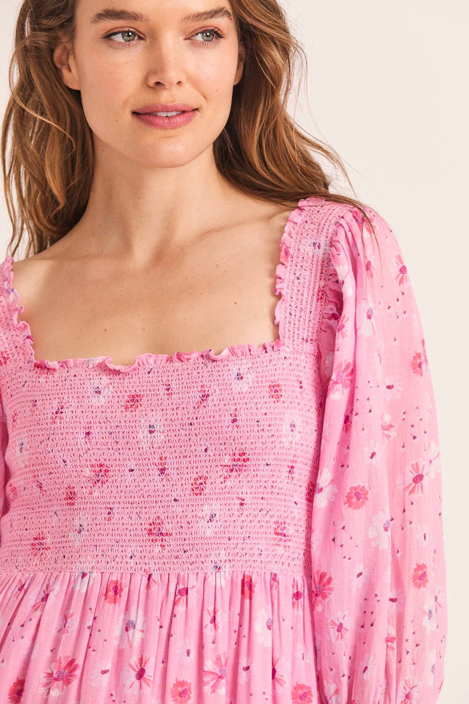Go with the flow in our Miri Dress in 100% cotton with a hand-painted tossed daisy print. This midi-dress has a ruffle-trimmed square neckline, worn on or off the shoulder. The bodice and bracelet sleeve openings are smocked above a shirred skirt with side-seam pockets, raw ruffle details and a slit at wearer’s right. Accessorize it with our Lorna Barrette. Shown here in Coral Blaze.