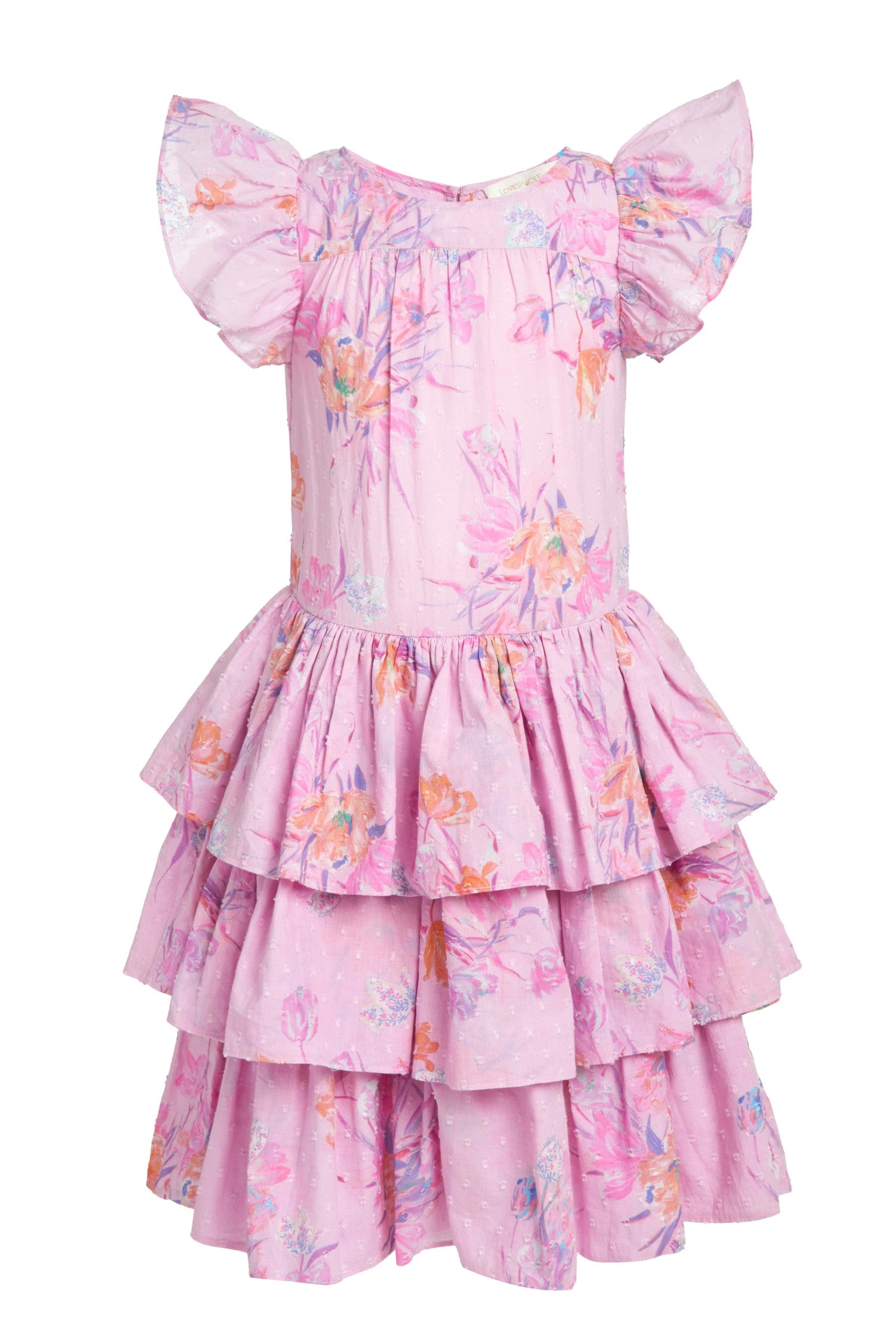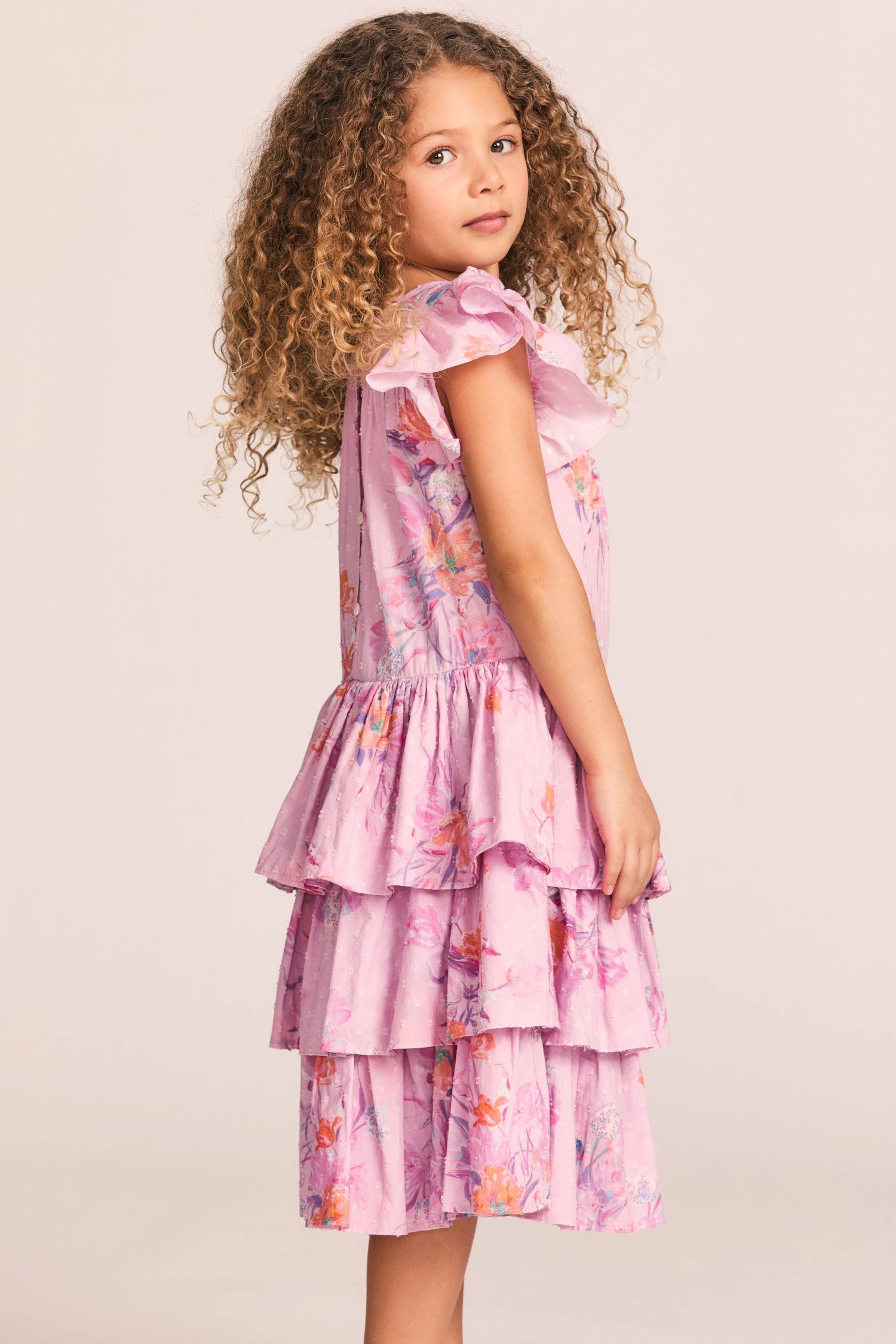 This season, our Callie Dress returns in 100% cotton with polkadot embroidery and a tulip garden print. Flutter sleeves frame the roomy bodice. An encased elastic waist lets out into a three-tiered ruffle skirt. Shown here in Royal Pink Berry.