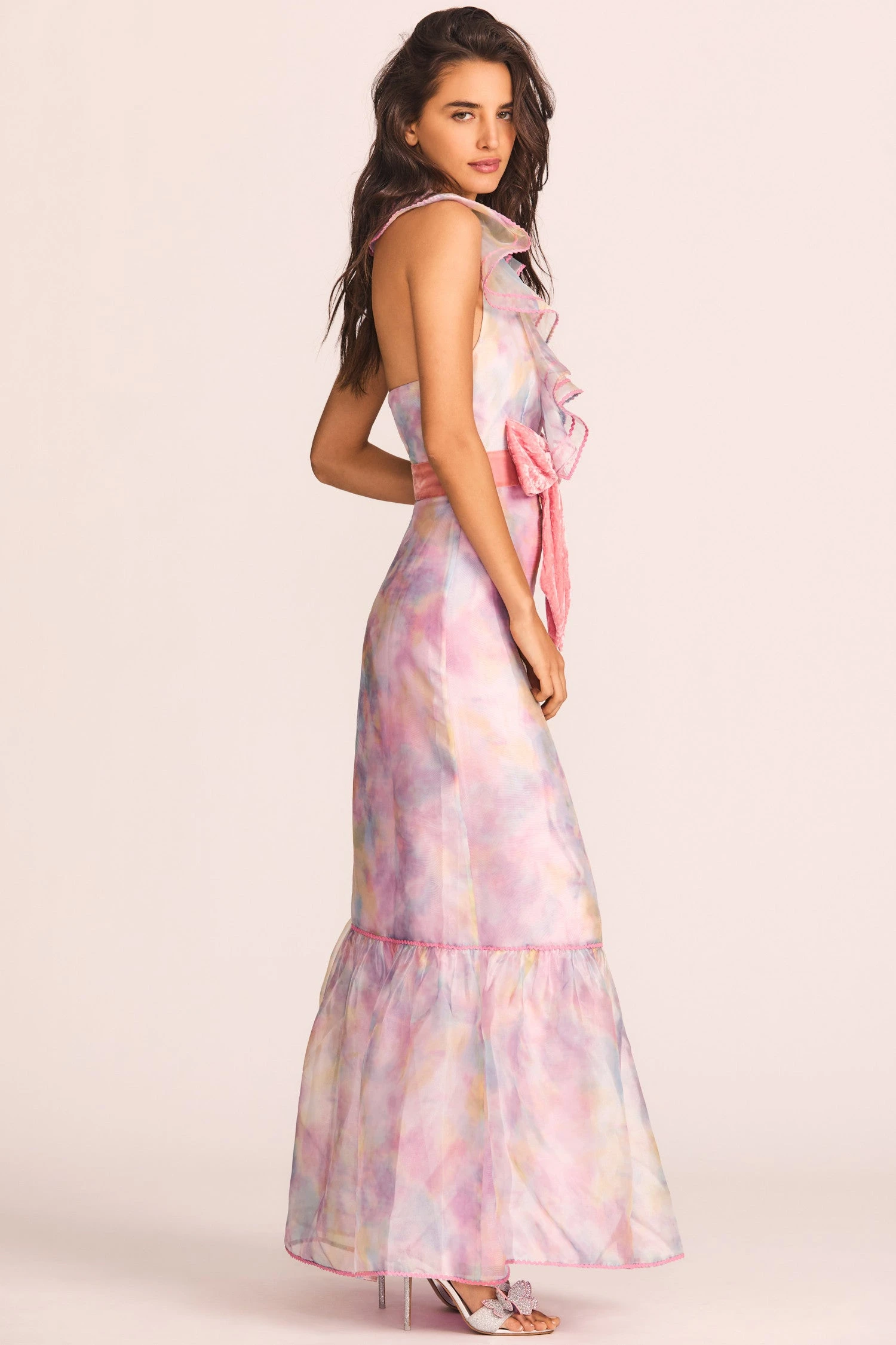 Our Maris Gown is magic in organza with a cloudy rainbow print and contrast rickrack trim detailing. This ethereal dress has a rounded v-neck, framed by a double ruffle, that fastens behind the neck with a hook-and-eye closure. A crushed velvet bow graces the empire waist at center front. Below, the skirt sweeps to a generous flounce at bottom. Shown here in Fairytale Printed.