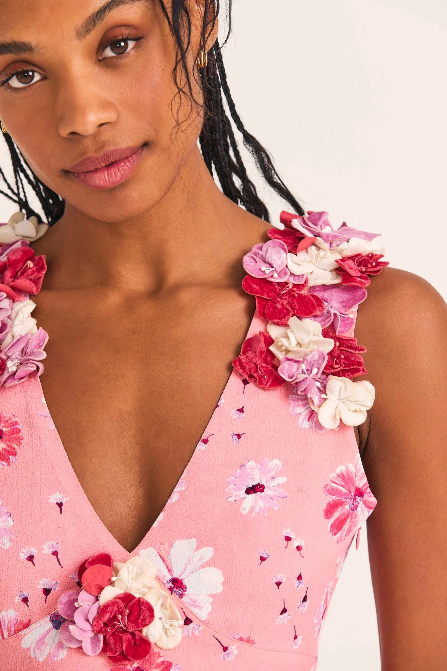 A LoveShackFancy favorite, our Shayna Dress arrives in a new viscose crepe fabric with a tossed daisy print and handmade crushed velvet flower appliqués. This festive party dress has a plunging v neckline, a fixed shaped waist and a shirred, double-tiered miniskirt. Accessorize it with our Lorna Barrette.