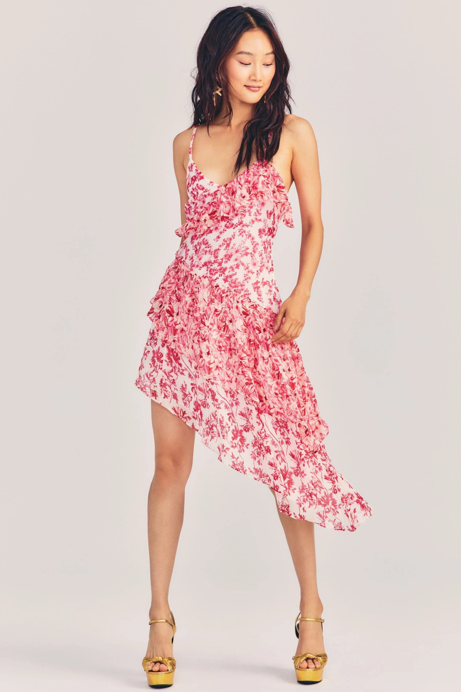 Our Newport Dress is new in 100% silk with a mix of monochromatic custom floral prints. This angled sundress has adjustable spaghetti straps, a v neckline and a faux wrap with a diagonal ruffle detail at front bodice. That motif is mirrored at the skirt with a second ruffle that trails down from the right hip above a final asymmetrical shirred flounce at bottom. Shown here in Campfire Breeze.