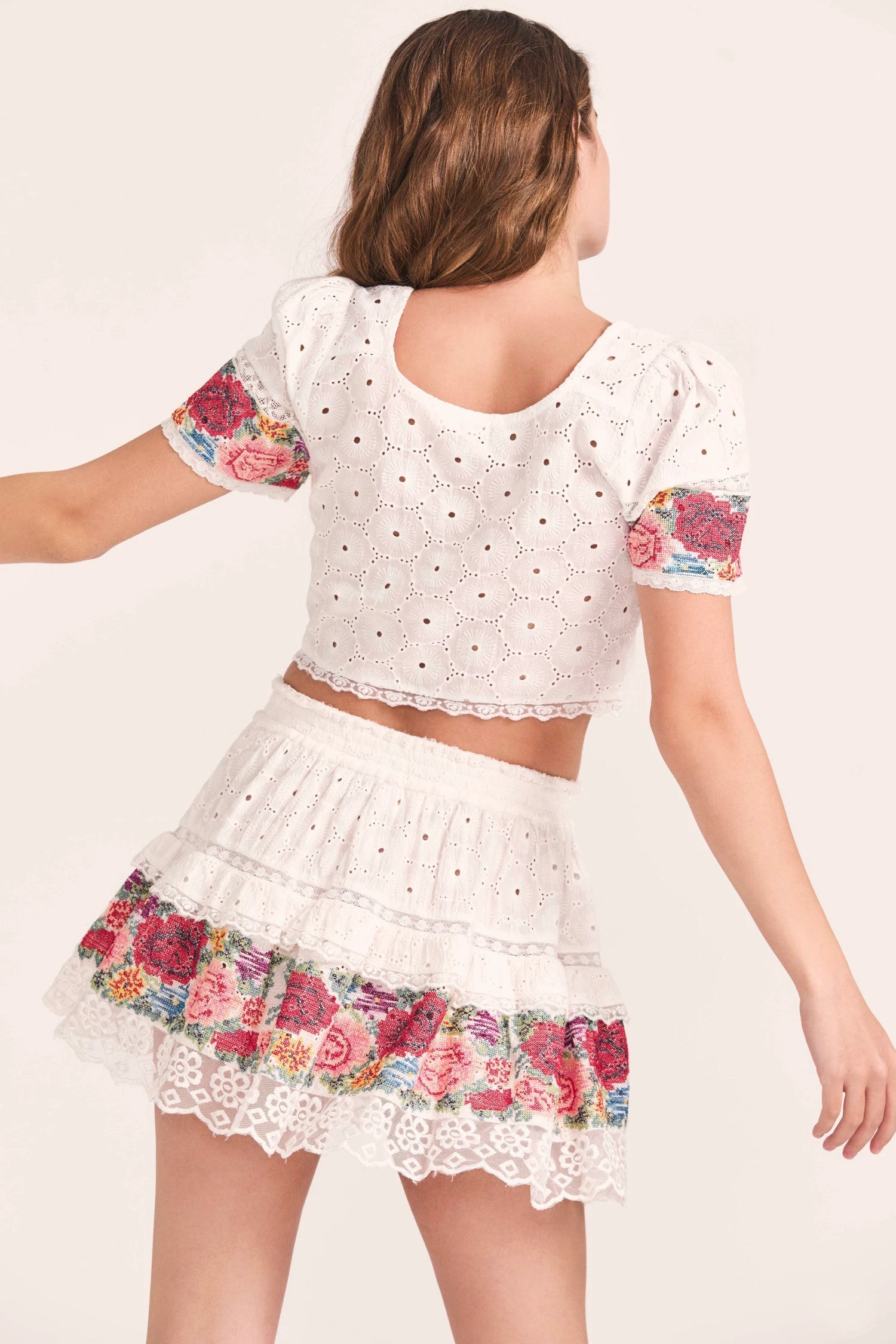 Our Shawna Skirt is a work of art in 100% cotton eyelet with needlepoint cross-stitch details and mixed custom lace panels. This slip-on miniskirt has a raw-edged encased elastic waistband and a slim top panel above one short and one long tier, trimmed in shaped lace. Wear it as a set with our Collum Crop Top.