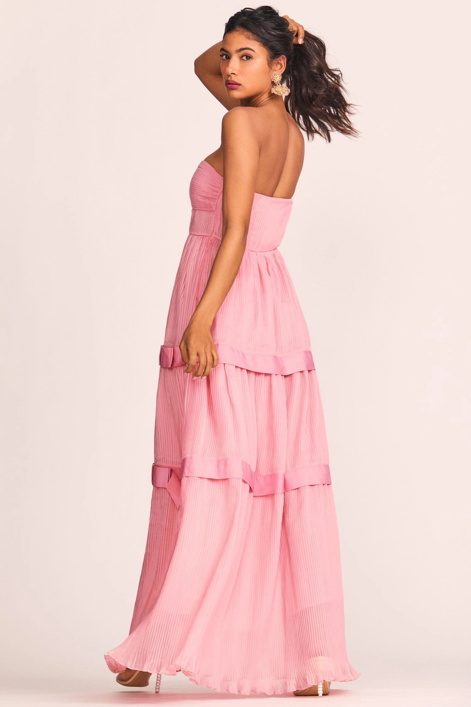 Our Teresa Gown is a vision in pleated organza with grosgrain ribbon details. This flowing dress is strapless with a prominent rosette at center bust. The fitted bodice features flattering princess seams to the waist, where it lets out into a dramatic full sweep skirt to the floor. Separate belt. Shown here in Candy Pink.