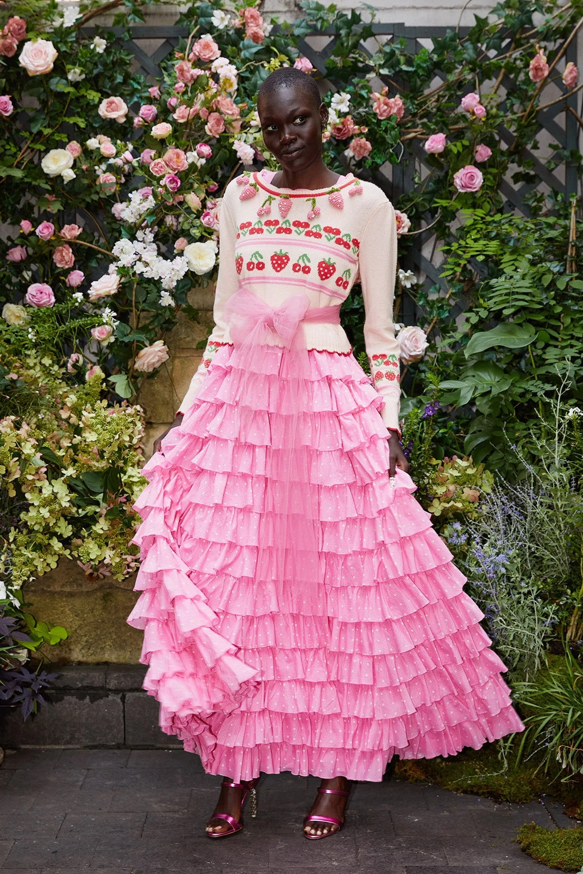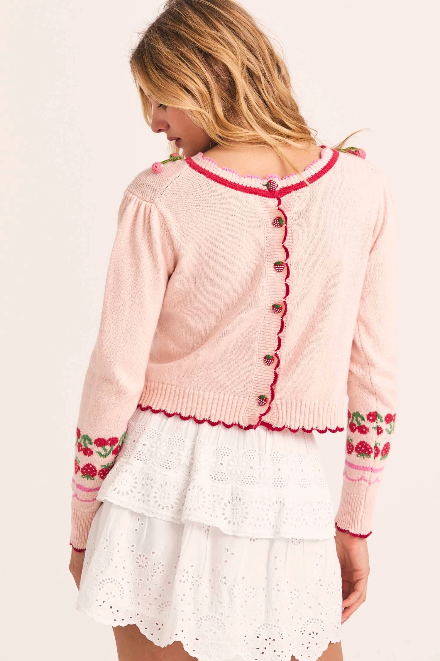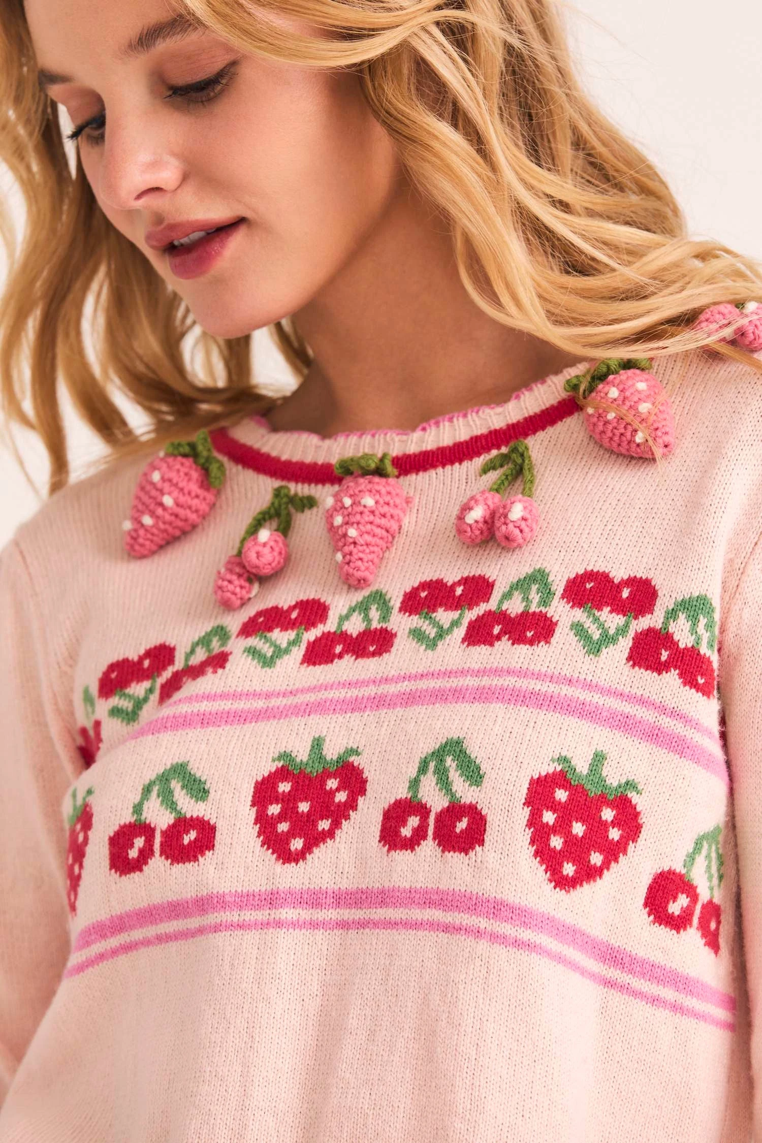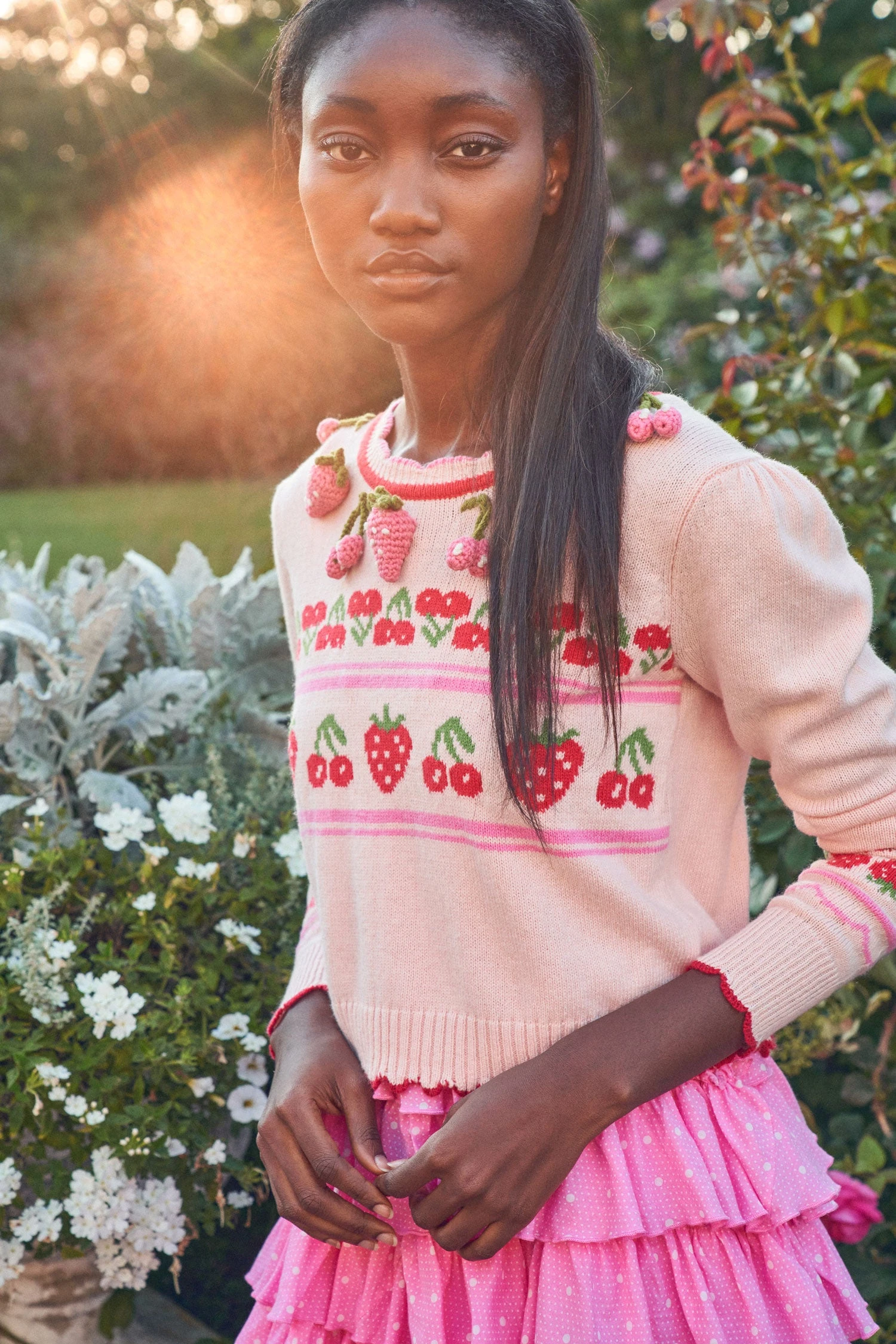 Our Renton Pullover is sweet as can be in a cotton-wool blend with a strawberry and cherry intarsia motif and hand-crocheted top-applied strawberries. This shrunken sweater has a subtle ribbed scoop neck, a ribbed cuff at sleeve opening and a ribbed bottom border with contrast scalloping. Strawberry buttons descend at center back. Pair it with our Ruffle Mini Skirt. Shown here in Pearl Blush.